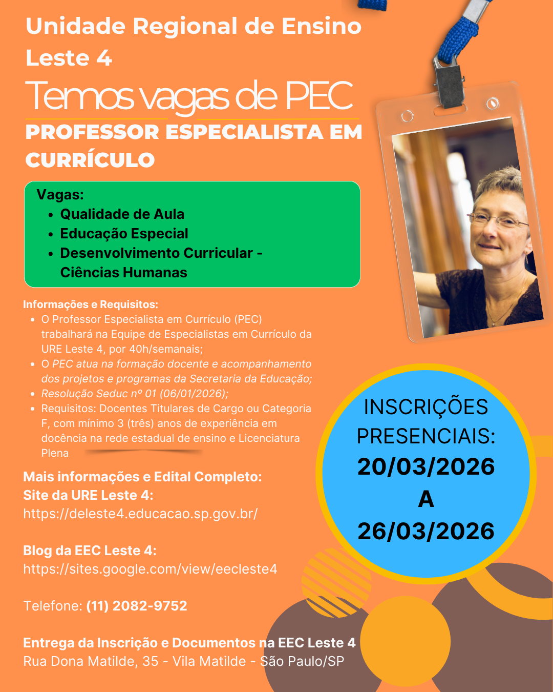 O Coordenador Geral, por meio da Unidade Regional de Ensino Leste 4, da Secretaria da Educação do Estado de São Paulo, com fundamento na Resolução Seduc 167/25 e na Portaria DIPES 21, de 19/12/25, torna pública a 2ª convocação para a atribuição de aulas referente ao PROCESSO SELETIVO SIMPLIFICADO de docentes destinados à atuação nos Itinerários de Formação Técnica Profissional (IFTP) do Ensino Médio da rede estadual.