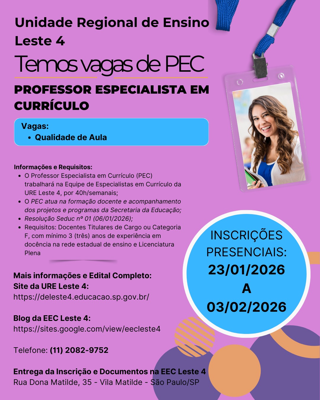 Edital Preenchimento de Vaga de Professor Especialista em Currículo (PEC) – JANEIRO/2026 22-01-2622 de janeiro de 2026 Enviar por e-mail Edital de credenciamento de PEC do Núcleo Pedagógico – Clique aqui Ficha de inscrição – Clique aqui LEIA TAMBÉM Edital de Seleção de Coordenador de Gestão Pedagógica – CGP Vagas Disponíveis – Professor Tutor de Anos Iniciais Edital de Suporte Pedagógico Supervisor de Ensino/Educacional Informativo da Comissão de Estágio Probatório